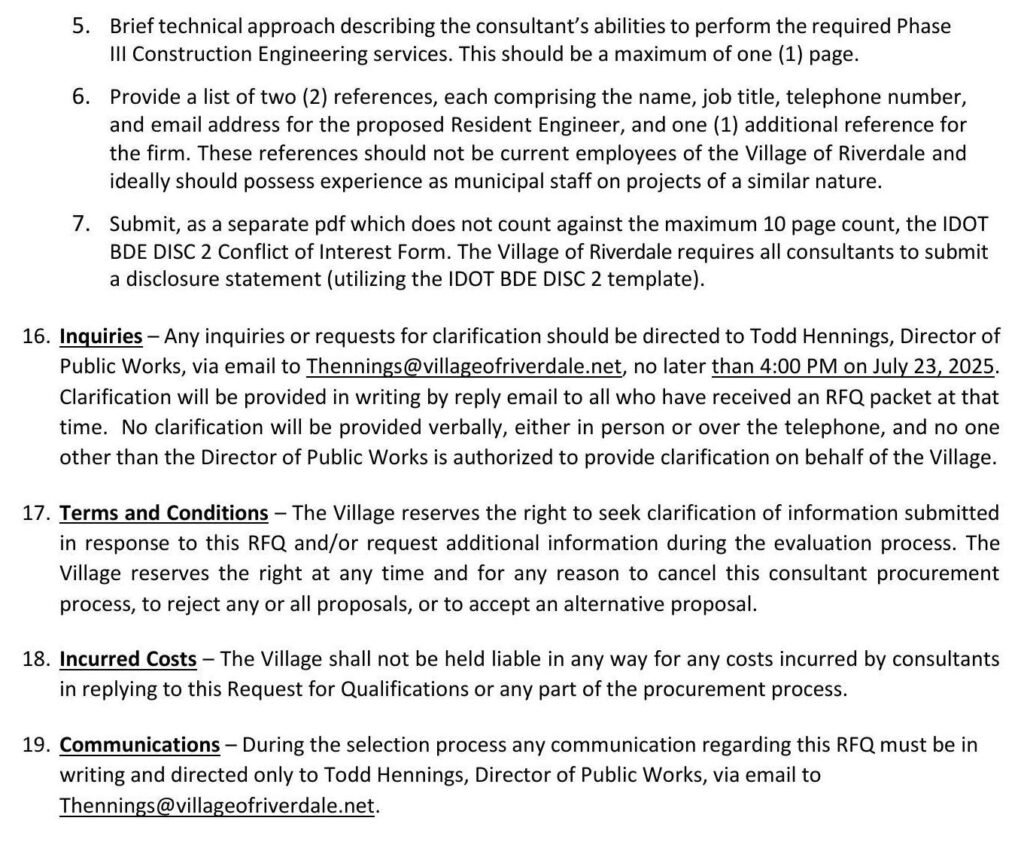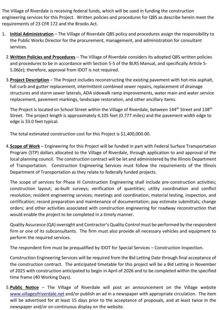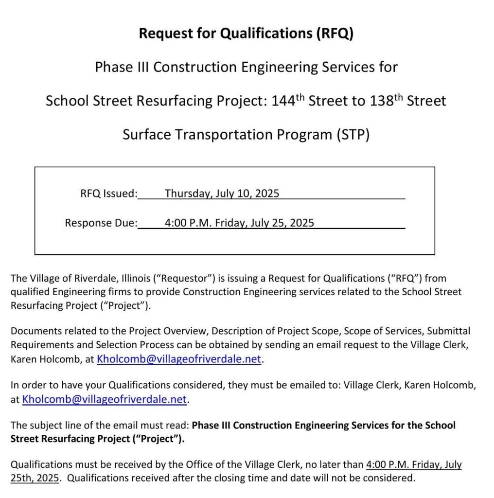 July 10, 2025 - In Blog By River Dale 0 Request for Qualifications: Construction Services for School Street Resurfacing Project Download Pdf Previous Early Garbage Pickup Notice Next Coffee WIth The Mayor